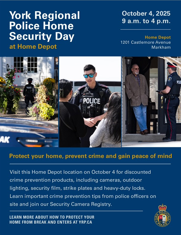 Through this collaboration with YRP and local retailers this initiative is finally becoming a reality. On Saturday, October 4th Councillor Keyes will join the YRP at the Home Depot at Markham Road and Castlemore for a home safety event: